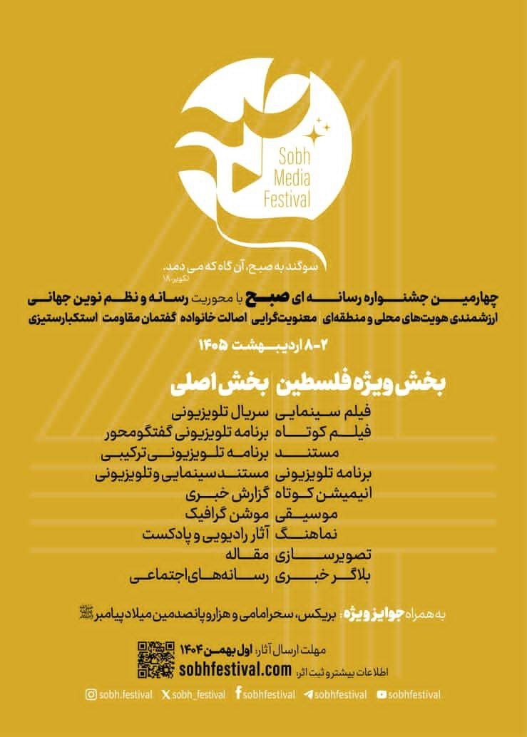 - بخش ویژه فلسطین (فیلم سینمایی، مستند، برنامه تلویزیونی، موزیک، موزیکویدیو، انیمیشن، هنرهای تجسمی)